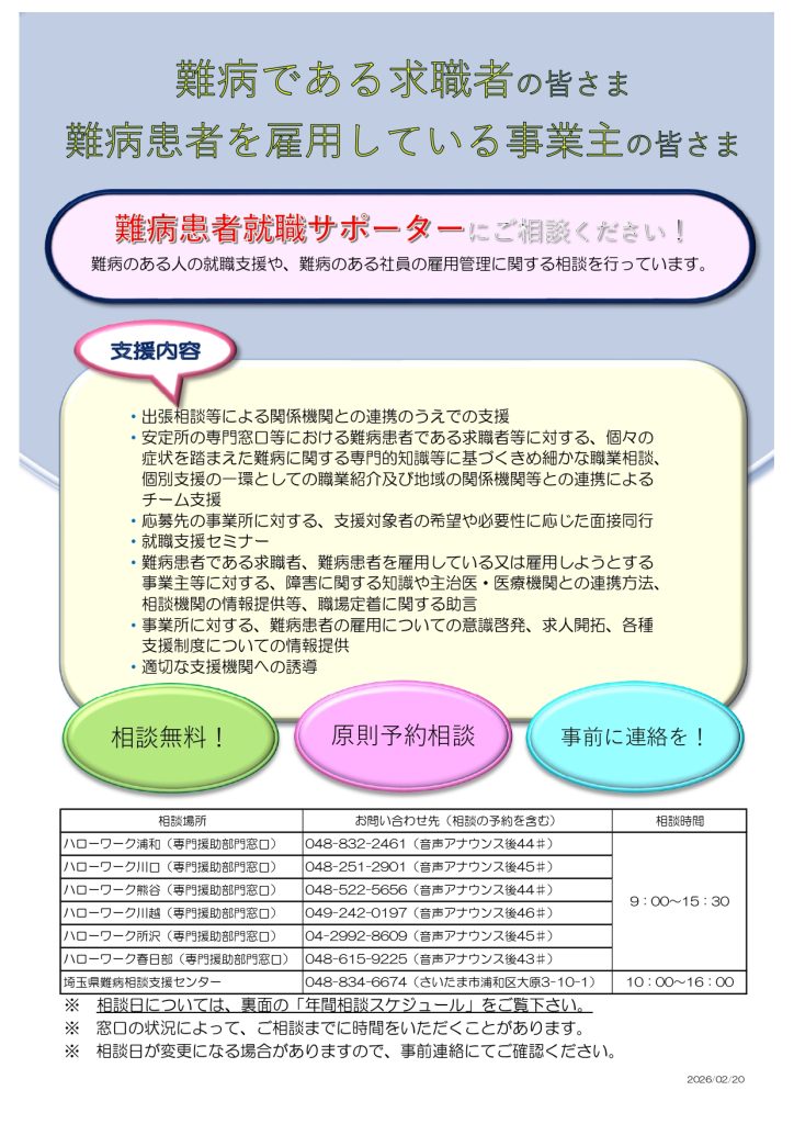 難病患者に対する様々な施策が整備されていく中で「埼玉県難病相談支援センター」が設置され、平成21年4月(2009)から「難病患者ピアサポート事業」を埼玉県から受託しています。埼玉県難病相談支援センターは、2ヶ所に分かれて開設されており、医療に関する相談は「国立病院機構東埼玉病院」で、難病相談支援員が難病患者さんや御家族の相談に応じます。一方、生活・就労に関する相談は「障難協」でピアサポーター(難病患者当事者やその家族)が、日常生活の相談やピアカウンセリング、患者会の紹介などを行っています。また、難病団体協議会として県当局や議会関係者へ直接意見を伝えたりもしています。